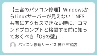 三ノ宮から徒歩2分のパソコン修理店「パソコン修理サービス」です!「Linuxサーバーの共有フォルダ(NFS)が、Windowsからマウントできない」 「コマンドプロンプトで『ネットワークエラー 53』が出る」 「フォルダは見えているのに、書...