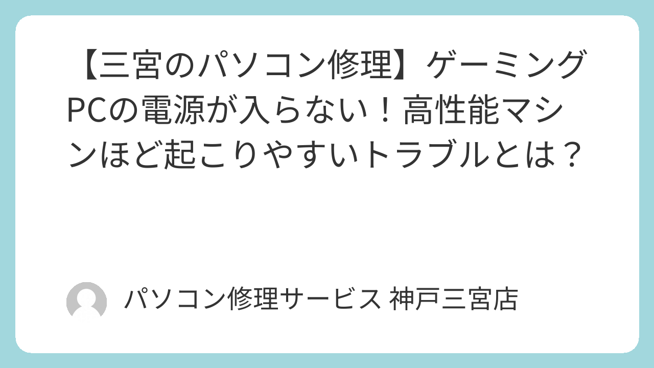 もし「ゲーミングPCの電源が入らない」「突然落ちて動かなくなった」といった症状が出たら、パソコン修理サービス 神戸三宮店 にご相談ください。