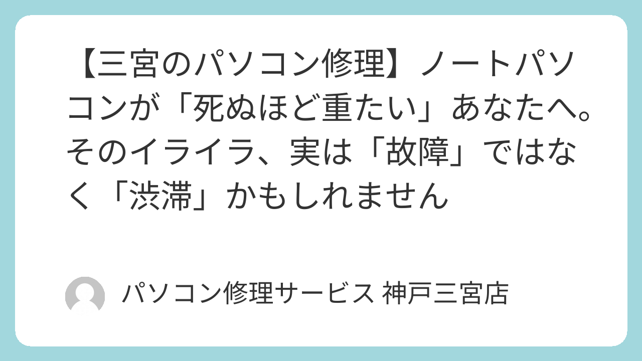 神戸・三宮エリアで、ノートパソコンの遅さにお悩みの方。 買い替える前に、一度当店へお立ち寄りください。無料診断で、「このパソコンがどこまで速くなるか」を正直にお伝えします。
