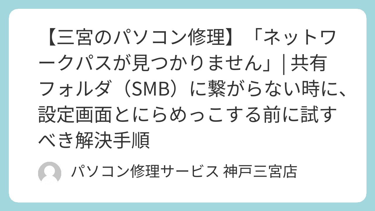 1. 持ち込み診断・出張設定 ノートパソコンをお持ち込みいただければ、設定の確認や、SMB 1.0の有効化、資格情報のクリアなどをその場で行います。 また、社内ネットワーク全体の問題であれば、神戸市内外への出張サポートもご相談可能です(要予約)。