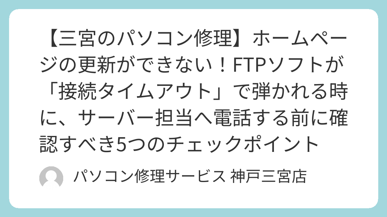 FTPのトラブルは、Web制作やお仕事に直結するだけに、一刻も早い解決が求められます。 ご自身での解決が難しい場合は、ぜひ三宮駅から徒歩2分の「パソコン修理サービス 神戸三宮店」にご相談ください。