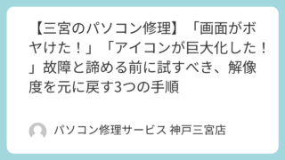 三ノ宮から徒歩2分のパソコン修理店、パソコン修理サービスです。今回は、突然パソコンの画面が見づらくなる「解像度トラブル」についてお話しします。昨日までは綺麗に映っていたのに、急に画面が粗くなったり、アイコンが大きくなったり、あるいは画面の端...