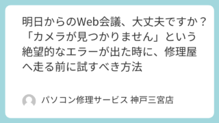 PCトラブル 明日からのWeb会議、大丈夫ですか?「カメラが見つかりません」という絶望的なエラーが出た時に、修理屋へ走る前に試すべき方法 三ノ宮から徒歩2分のパソコン修理店「パソコン修理サービス」です!「明日、大事なオンライン面接があるんです!」 「月曜日の朝イチで、クライアントとのWeb会議が入っているのに…」 「Zoomを立ち上げても画面が真っ暗で、自分の顔が映らない」 ... 2026.02.03 PCトラブル知恵袋