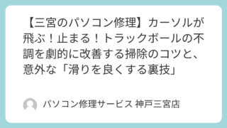 知恵袋 【三宮のパソコン修理】カーソルが飛ぶ!止まる!トラックボールの不調を劇的に改善する掃除のコツと、意外な「滑りを良くする裏技」 三ノ宮から徒歩2分のパソコン修理店、パソコン修理サービスです。トラックボールは構造上、普通のマウスよりもゴミが溜まりやすく、また非常に繊細な動きを要求されるデバイスです。 普通のマウスなら、動きが悪ければ持ち上げてガシガシと振ったり、マウス... 2026.02.17 知恵袋