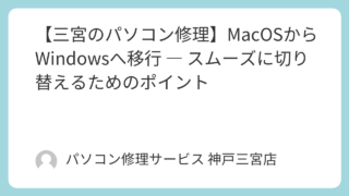 知恵袋 【三宮のパソコン修理】MacOSからWindowsへ移行 ― スムーズに切り替えるためのポイント 三ノ宮から徒歩2分のパソコン修理店「パソコン修理サービス」です!これまでMacを使ってきた方が「やっぱりWindowsに戻したい」「仕事の都合でWindowsに統一しなければならなくなった」というケースは珍しくありません。Macはデザインや... 2025.09.02 知恵袋