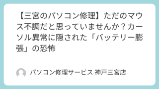 PCトラブル 【三宮のパソコン修理】ただのマウス不調だと思っていませんか?カーソル異常に隠された「バッテリー膨張」の恐怖 三ノ宮から徒歩2分のパソコン修理店「パソコン修理サービス」です!神戸の街もイルミネーションや冬の装飾で華やぐ季節になりましたね。 私たちは日々、ここ三宮のセンター街近くで、皆様のパソコンに関するお悩みと向き合っています。さて、今日取り上げた... 2025.12.18 PCトラブル知恵袋