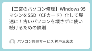 PCトラブル 【三宮のパソコン修理】Windows 95マシンをSSD(CFカード)化して爆速に!古いパソコンを壊さずに使い続けるための鉄則 三ノ宮から徒歩2分のパソコン修理店、パソコン修理サービスです。今は2026年。 Windows 95が発売されてから、なんと30年以上が経過しました。もはや「レトロ」を通り越して「歴史的遺産」と言っても過言ではないOSです。しかし、驚かれる... 2026.02.21 PCトラブル知恵袋
