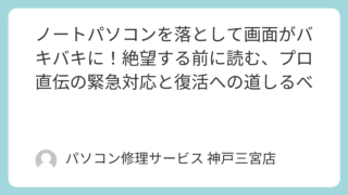 三ノ宮から徒歩2分のパソコン修理店「パソコン修理サービス」です!神戸の街は坂道も多いですし、通勤ラッシュの電車内や、おしゃれなカフェでの移動中など、ノートパソコンを持ち歩く機会は多いものです。 そんな日常の中で、突如として訪れる「悪夢」の瞬...