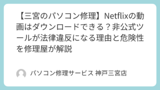 PCトラブル 【三宮のパソコン修理】Netflixの動画はダウンロードできる?非公式ツールが法律違反になる理由と危険性を修理屋が解説 三宮駅から徒歩2分のパソコン修理サービス 神戸三宮店です。長時間の移動や旅行先でのリラックスタイムに向けて、スマートフォンやパソコンにNetflixの映画やドラマを保存しておきたいと考える方も多いのではないでしょうか。 店頭でも「インターネ... 2026.04.24 PCトラブル知恵袋