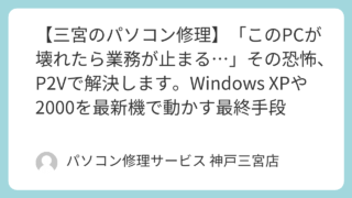 知恵袋 【三宮のパソコン修理】「このPCが壊れたら業務が止まる…」その恐怖、P2Vで解決します。Windows XPや2000を最新機で動かす最終手段 捨てられないパソコン、ありませんか? 最新のWindows 11が搭載されたピカピカの新品ではなく、黄色く変色したベージュ色のケースに入った、分厚くて重たい古のパソコンのことです。「この経理ソフト、Windows XPでしか動かないんだよ」... 2026.02.20 知恵袋