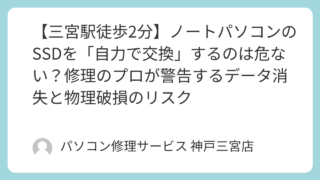 PCトラブル 【三宮駅徒歩2分】ノートパソコンのSSDを「自力で交換」するのは危ない?修理のプロが警告するデータ消失と物理破損のリスク 三宮駅から徒歩2分の「パソコン修理サービス 神戸三宮店」です。さて、パソコンの動作を劇的に速くし、保存容量を増やすための最も効果的な手段といえば「SSD(ソリッドステートドライブ)の交換・増設」です。 しかし、パソコン修理の最前線にいる私た... 2026.03.13 PCトラブル知恵袋
