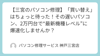 知恵袋 【三宮のパソコン修理】「買い替え」はちょっと待った!その遅いパソコン、2万円台で“最新機種レベル”に爆速化しませんか? 電源ボタンを押してから、トイレに行って、コーヒーを淹れて戻ってきても、まだ画面がくるくると回っている。 クリックしたはずのエクセルが、忘れた頃にパッと開く。 日本語を入力しようとすると、変換候補が出るまでに一瞬の間が空く。「あーもう! 遅い... 2026.03.04 知恵袋