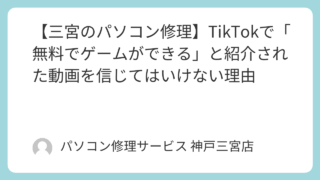 PCトラブル 【三宮のパソコン修理】TikTokで「無料でゲームができる」と紹介された動画を信じてはいけない理由 三ノ宮から徒歩2分のパソコン修理店「パソコン修理サービス」です!「TikTokで“無料で○○のゲームを遊べる!”って動画が流れてたけど、本当に大丈夫?」最近、このような疑問を持つ方をよく見かけます。特にパソコンでSNSを見ている人には、「い... 2025.10.15 PCトラブル知恵袋