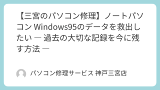 PCトラブル 【三宮のパソコン修理】ノートパソコン Windows95のデータを救出したい ― 過去の大切な記録を今に残す方法 ― 三ノ宮から徒歩2分のパソコン修理店「パソコン修理サービス」です!1995年に登場した Windows95 は、日本のパソコン文化を大きく変えた存在でした。当時はインターネットの普及が始まり、パソコンが一気に家庭に浸透していった時代です。今で... 2025.10.09 PCトラブル知恵袋